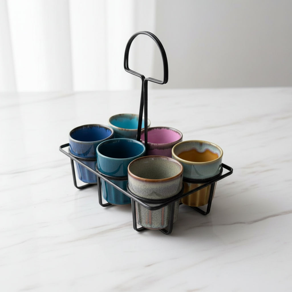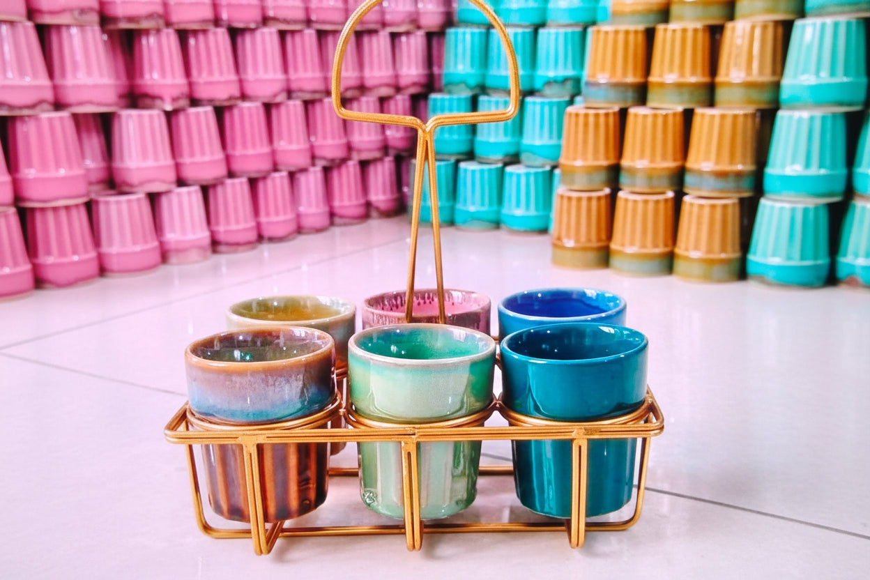 Kadak Chai Tea Cups Set of 6 - Handcrafted Pottery Cups with Frame
